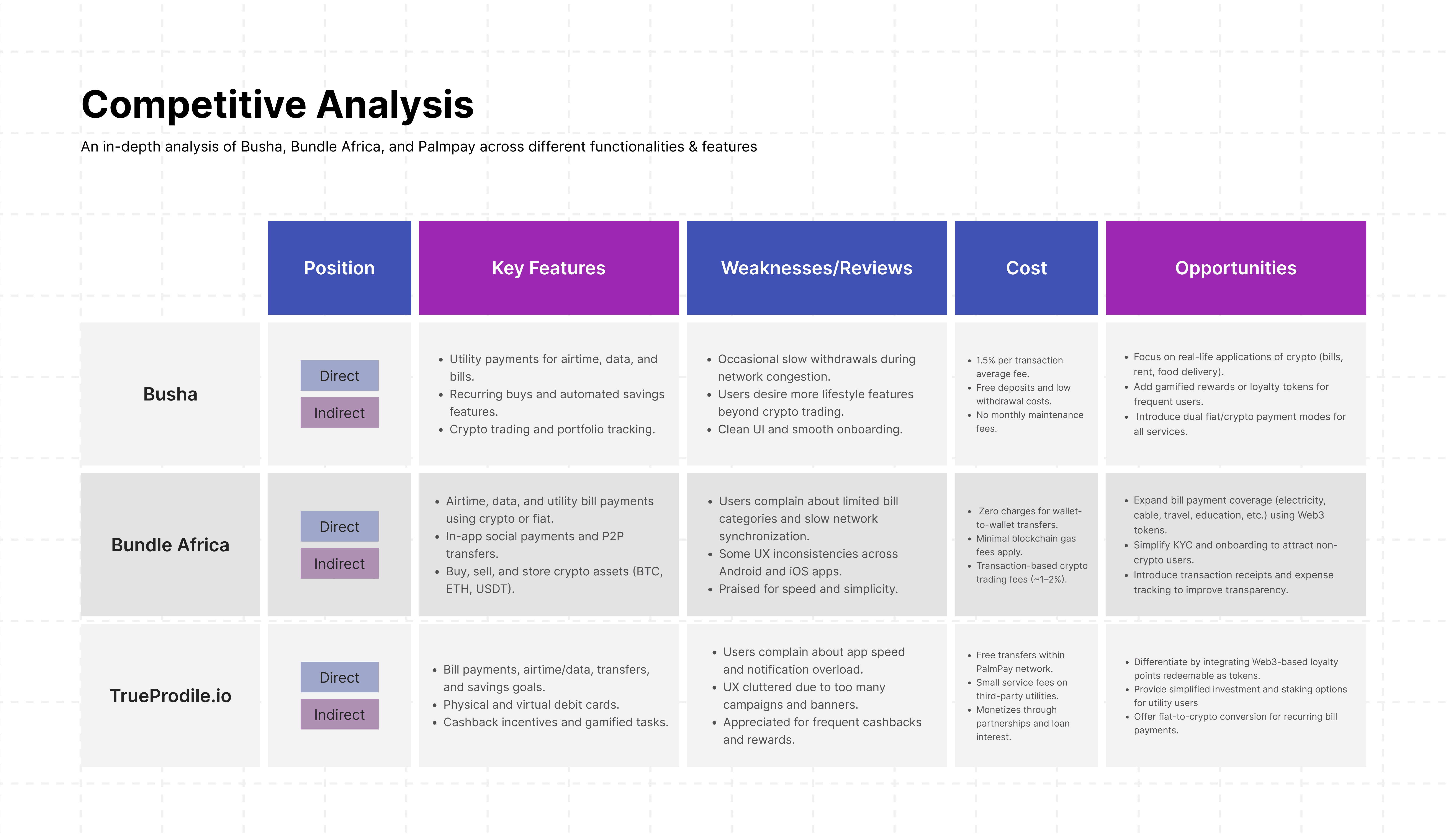 Competitive Analysis: I analyzed similar fintech and Web3 platforms like Bundle, Binance Pay, and PalmPay, identifying their key features and shortcomings: