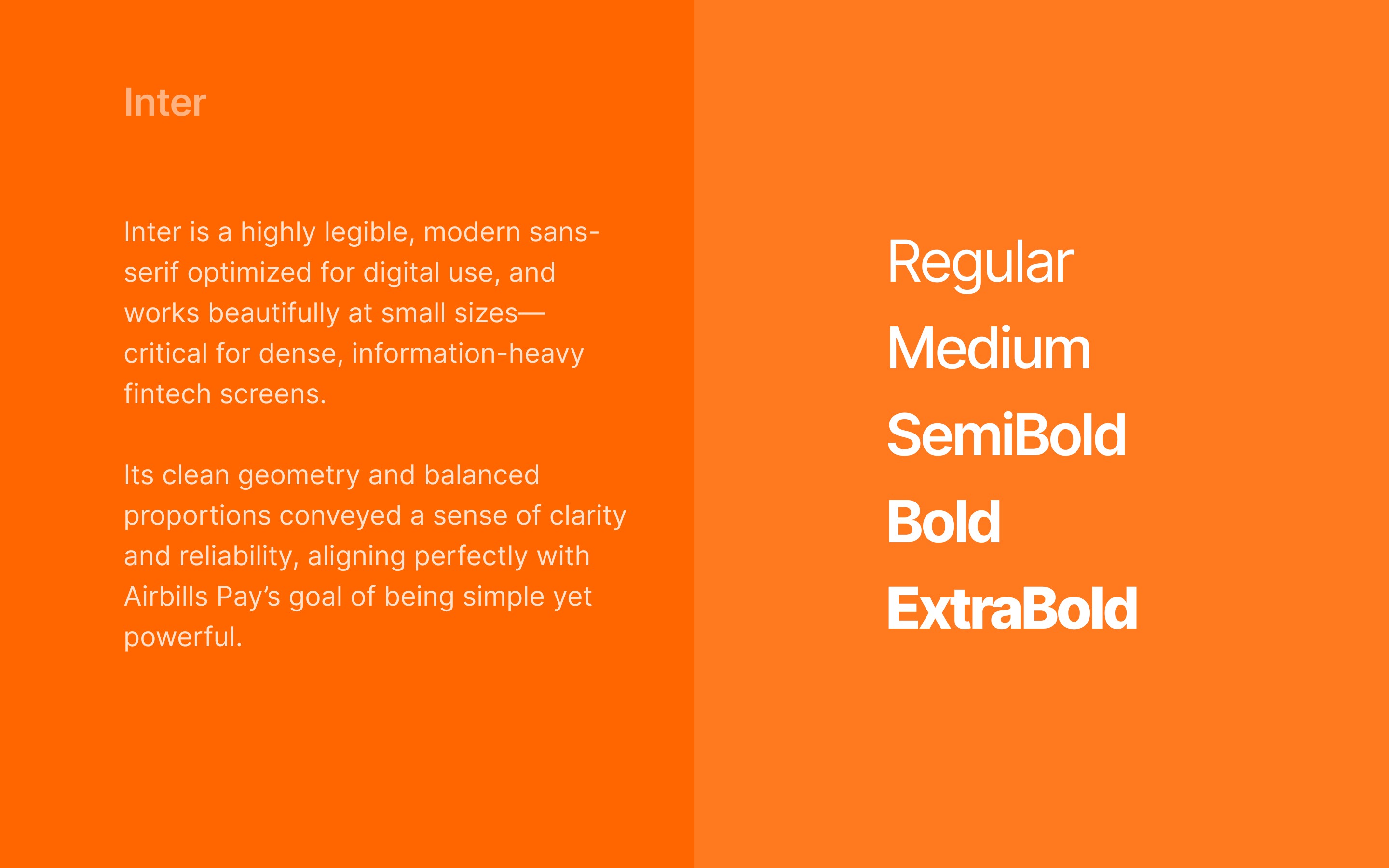 The brand’s primary color (#FF6600) became the foundation of the app’s visual identity. Orange represents energy, confidence, and action, which fit perfectly for a payment platform that aims to empower users to transact swiftly and securely.